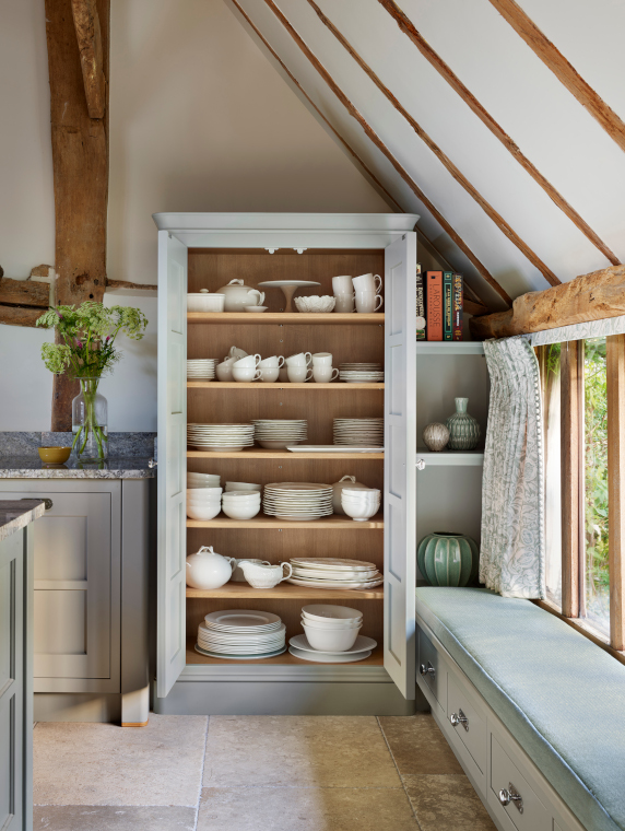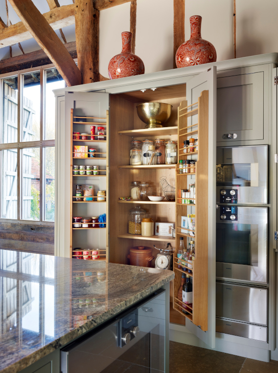 A large number of appliances and cooking equipment needed to be stored out of sight, making hidden storage an essential part of the brief. Alongside deep drawers in the island and wall run, a capacious larder, an appliance/breakfast cupboard and a bespoke china cabinet were included.