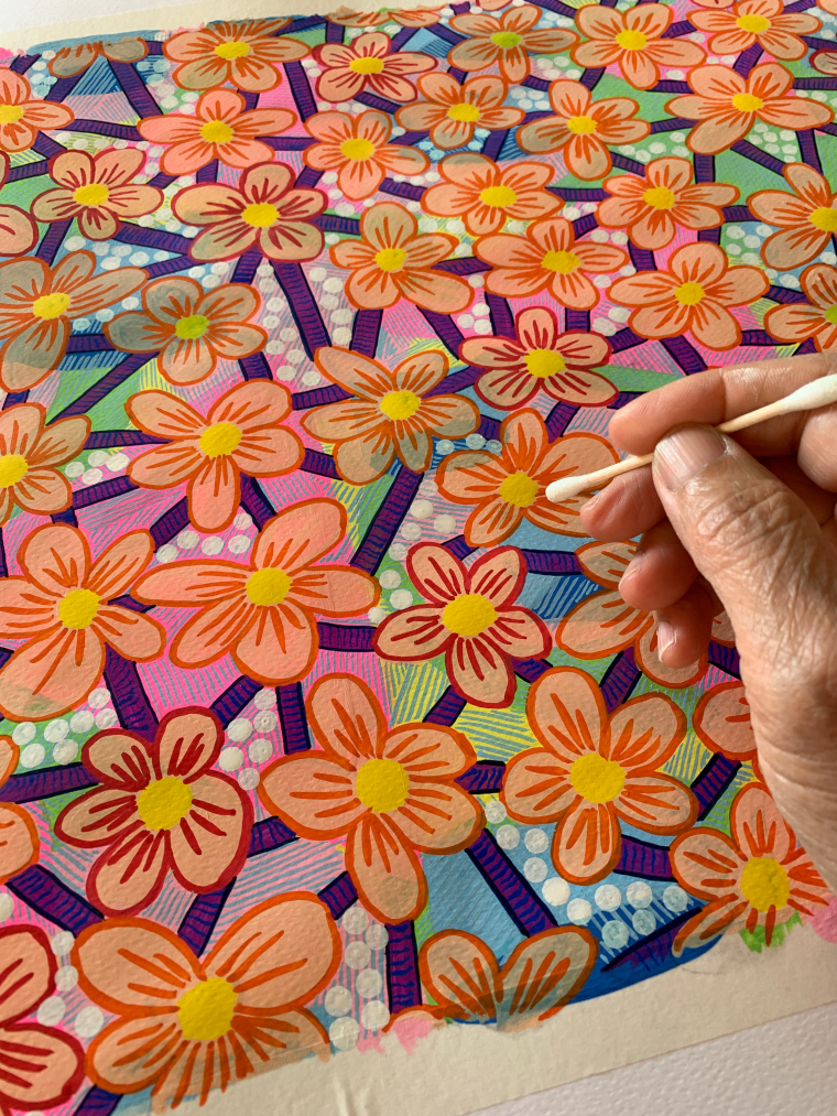 Each day as soon as I woke up, I began painting spontaneously and worked in layers. I listened to audiobooks. Sometimes I’d finish late afternoon, other times I worked to beat the clock at midnight. I always stopped to make my three meals and take a walk. This routine helped me focus, to pass the time but also to take my mind off the lockdown. I didn’t know how long it would take so I just kept painting. I started with small pieces and moved on to larger pieces. Before I knew it 100 days had passed, and I had 100 patterns. It was a good number to end on and to then start something new.