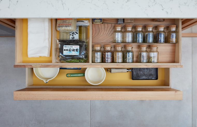 We chose yellow vinyl to line the base of each bespoke drawer which includes a knife block and a special spice drawer.