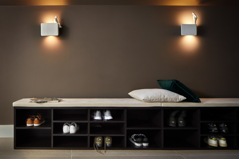 The cinema room is accessed through the ‘magic’ corridor; a dramatic walkway that uses distorted mirrors to create a fun atmosphere. Our spectacular Baffo Spotlight (by Matteo Bianchi Studio) is positioned in the middle of the corridor, which adds to the uniqueness of the walkway.
