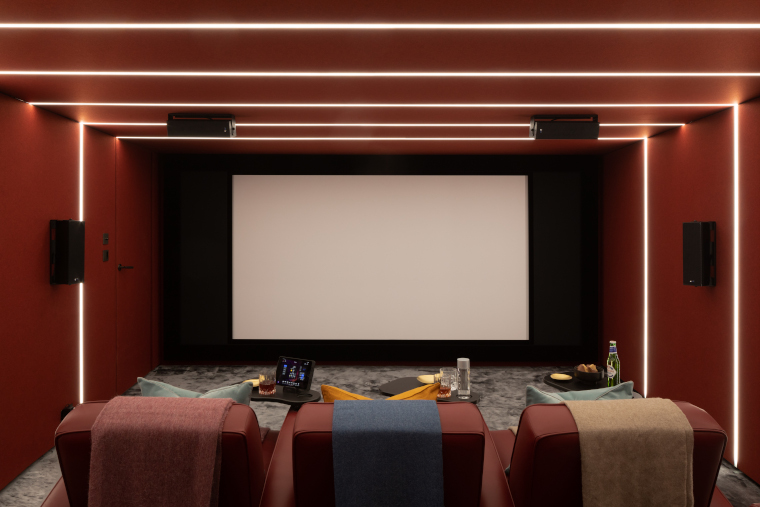 An incredible reference-level cinema with a Dolby Atmos 9.4.4 surround sound system and Barco Cinemascope projector balances technical performance, acoustics and a space-efficient design. The full-wall projected images combined with the dynamic lighting effects are visually striking.