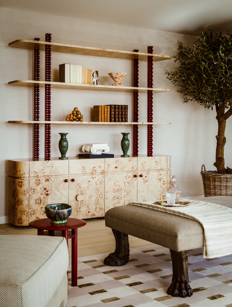 Recently, Charu created a bespoke cabinet in mappa burr wood veneer, finished with a dramatic cherry red lacquer detail – and cites these two finishes as some of her favourites. She says that lacquer’s appeal is enduring and she expects to see this finish used in more inventive ways in the year ahead.