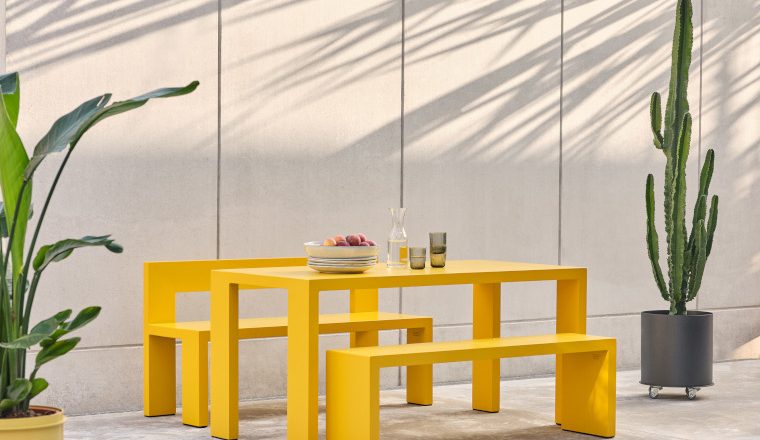 This giddy behaviour inspired me to investigate new furnishings that have been launched for outdoor spaces including a durable rug, bright yellow aluminium table and a Moroccan inspired chair.