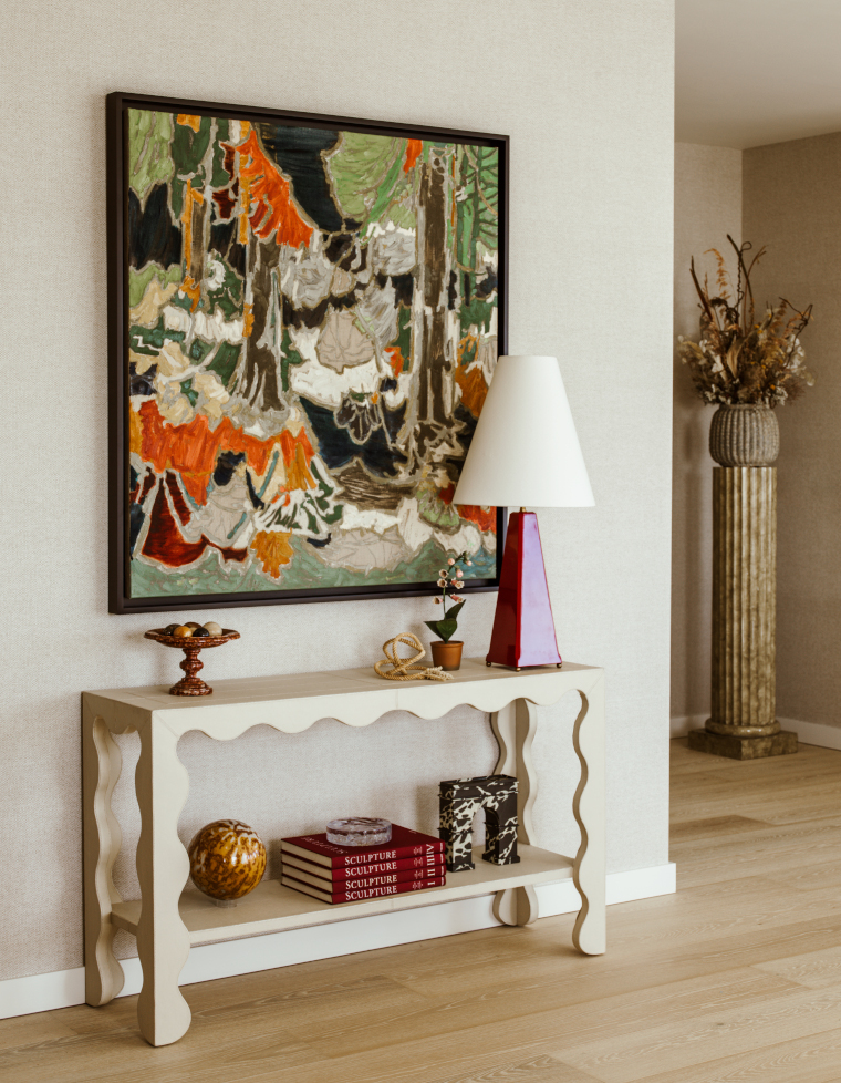 Located at The Broadway in Westminster, the 3,218 sq ft apartment is transitional in style, featuring a crisp contemporary base layered with mid-century inspired swooping curves and warm finishes.