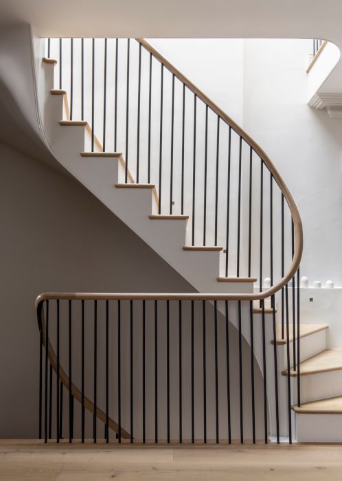 Connecting each level of the property and enhancing the flow, TR Studio designed and installed a bespoke staircase. The continuous design, which runs from the lower ground floor up to the first floor, features a sweeping curved handrail mirroring the shape of the walls and newly installed skylight.