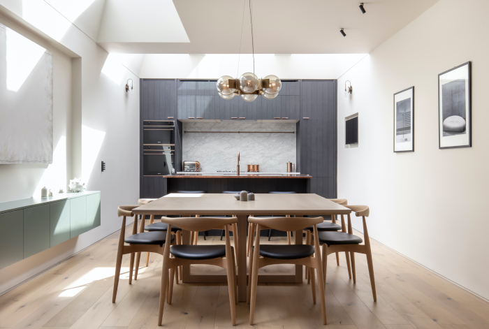An un-used rear garden courtyard was fully enclosed and converted to become part of the internal lower ground floor, including a large openable glass skylight. Relocating the kitchen under the glass roof flooded the space with daylight and provided natural ventilation. The kitchen itself, Sebastian Cox for deVOL, features black stained beech cabinetry and a marble backsplash striking the balance between traditional and contemporary. A copper worktop was installed on the island, its unique patina coming to the fore under the skylight