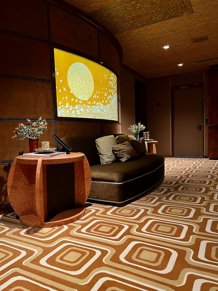 This home cinema space embodies comfort and sophistication, centred around an unusually constructed sunken seating area, thoughtfully designed to immerse viewers in the intimate environment.