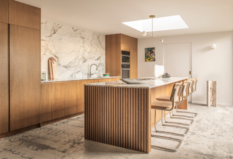 At the heart of the home, an oak kitchen was designed by TR Studio and made by GEB London with Calcatta marble splash back and worktop. A sky light was fitted above the island, instead of an extractor, to provide natural ventilation and airflow and flood the area with light.
