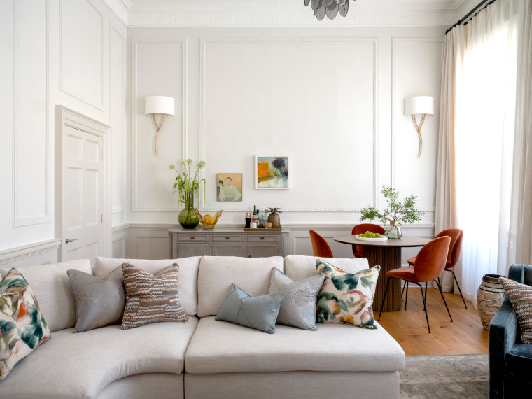 Better use was made of the open plan living space by zoning it for dining and living. A bespoke, curved sofa was introduced to soften the room and to create a cosy area in which to relax and watch TV. A rug was added to anchor the furniture and dampen the acoustics – always a challenge given the high ceilings. For the dining area, a bespoke table was designed and commissioned in solid oak, with a cylindrical, reeded timber base, accompanied by Gubi Beetle dining chairs in a rust velvet for a hint of opulence.