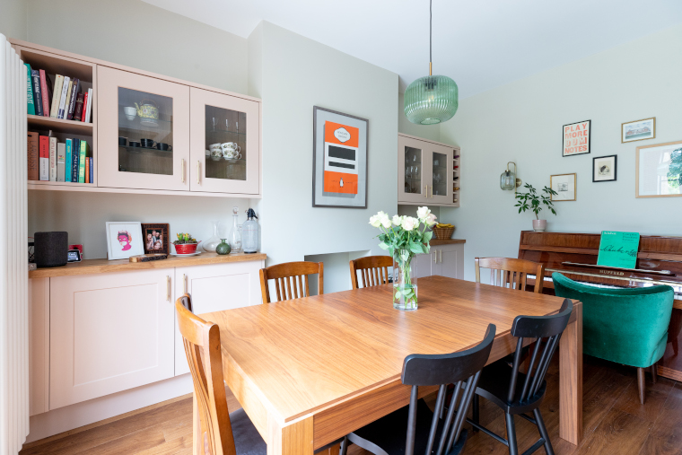 Wood flooring runs through the downstairs rooms providing a sense of cohesion, but in the dining end of the open plan space cupboards are painted blush pink as a soft contrast to the vibrant green kitchen.