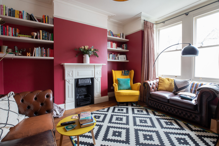 Colour returns in the living room with red walls providing a warm backdrop to an eclectic mix of furniture, books and personal possessions.