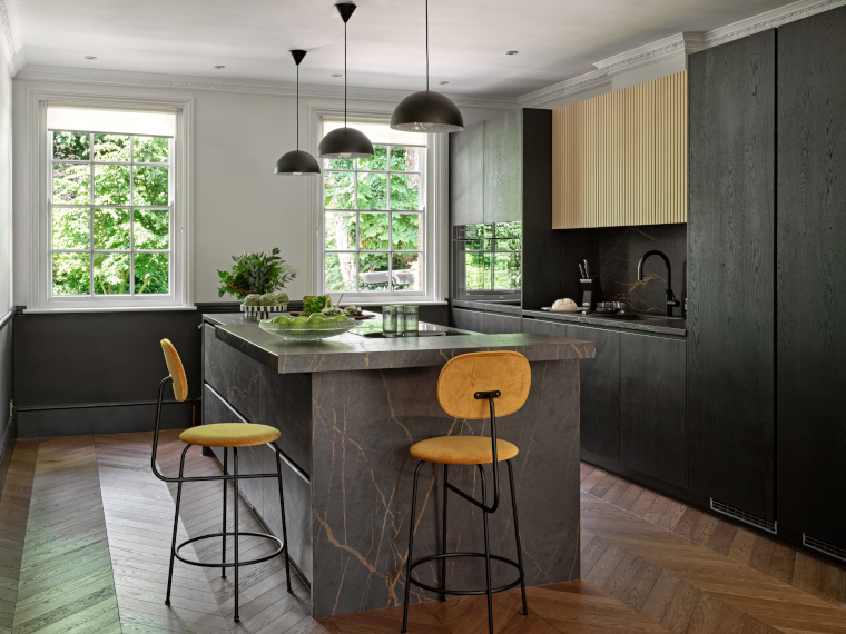 What was your starting point for the interior? As it’s the hub of most homes, it had to be the kitchen. We inherited an oak kitchen with a peninsular but we wanted something which packed a bit more of a punch. My moodboard consisted of strikingly dark designs that would work perfectly with the large sash windows. We chose a more contemporary design from Halcyon, but kept some period character by not taking the cabinets up to the ceiling to reveal the cornice detail and leaving one side of the room clear to keep the dado rail.