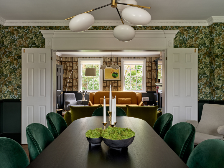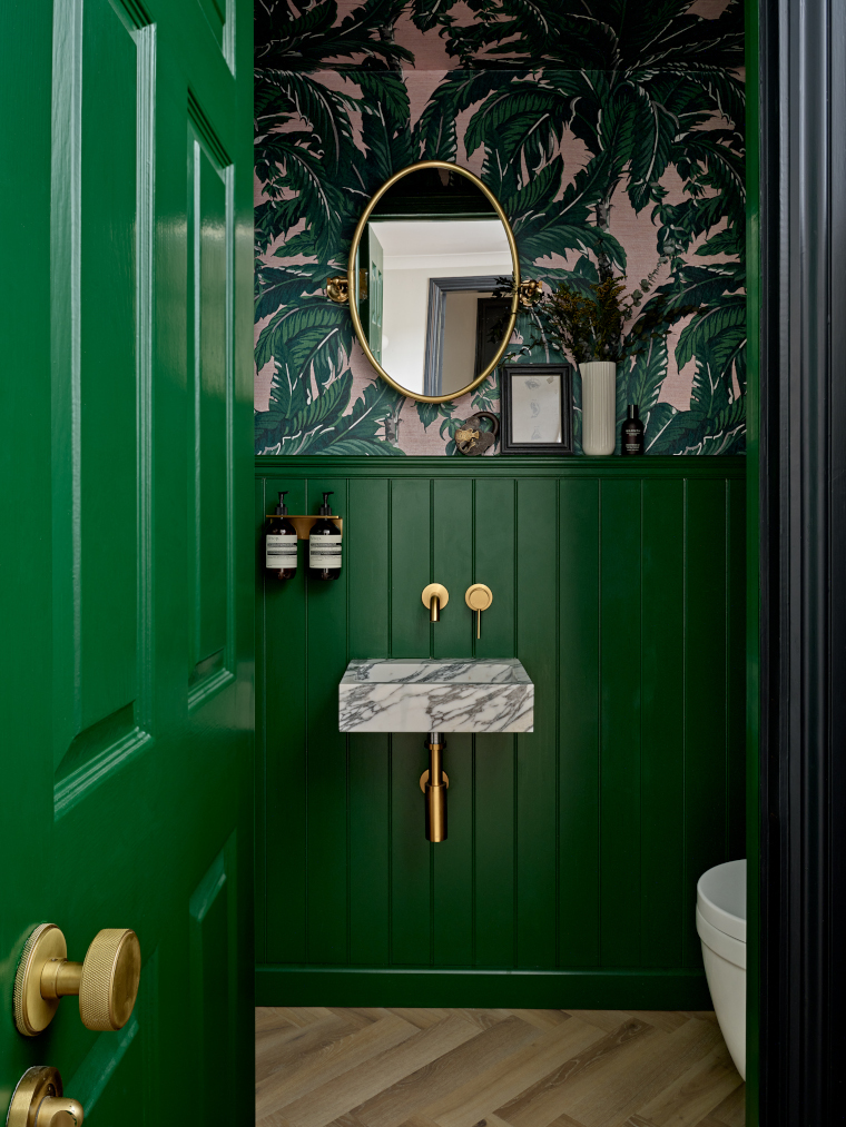 How did you decide on the colour palette? Being a Georgian style home, I knew it could handle some bold colours and patterns. As we started with the black kitchen, the dark theme continued along the panelling in the hallway and up the stairs, plus all of the doors were also painted in an inky/black shade. The more formal side of the home consists of a dining room and a reception room that was screaming out for some grand wallpaper and Cole & Son’s Royal Fernery and Ex Libris designs created the perfect mix of statement and atmosphere. I’ve added golds/mustards/greens as accent colours to pop against the dark walls, plus a surprise explosion of pink palm wallpaper up the walls and across the ceiling in the downstairs WC to add a bit of fun to the smallest room in the house.