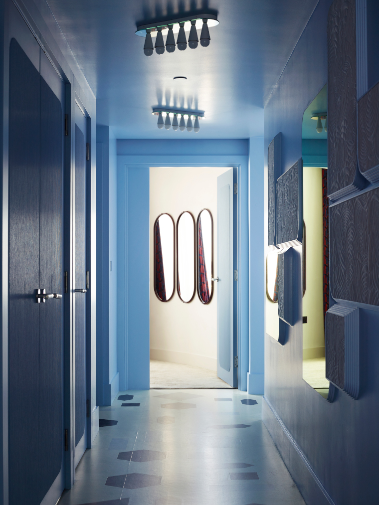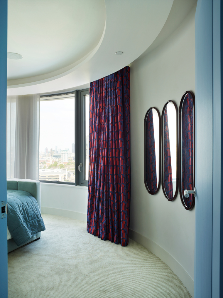How did you decide on the colour palette? The David Bowie painting was a big influence, the colour palette grew from there room by room. The curved hallway flows through the whole apartment and is reminiscent of the winding Thames below. It was also the only room with no windows (apart from a tiny one) and as the sky played such a big part in the remaining space, we painted it sky blue to bring that aspect into the centre of the apartment as well.