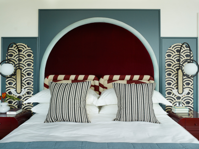 Can you tell me some of the brands used in the project – for example, the distinctive seating, lighting and textiles? Owl designed many of the key pieces of furniture and upholstery to really suit the space. We designed the curved back-to-back sofa to look both inwards toward the bespoke drinks unit and outwards to look at the view. The geometric shelving was designed to follow the curves of the architecture, we had the plaster finish continue from the walls over the shelving so it appears all as one but still stands out as a focal point. We really had fun in the bedrooms designing the striking headboards and the playful bedside tables in a lacquered finish. The patterned flooring throughout the main areas are also a bespoke design created by mixing different shades of Marmoleum.