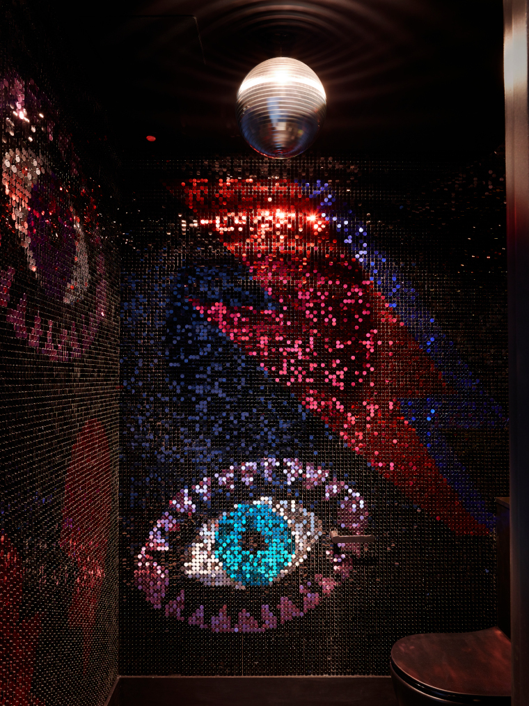 One of our only requests from the client was that when you opened the WC it played David Bowie’s Let’s Dance track! We took this and ran with it creating a complete disco toilet with shimmer sequin walls and a rotating disco ball.