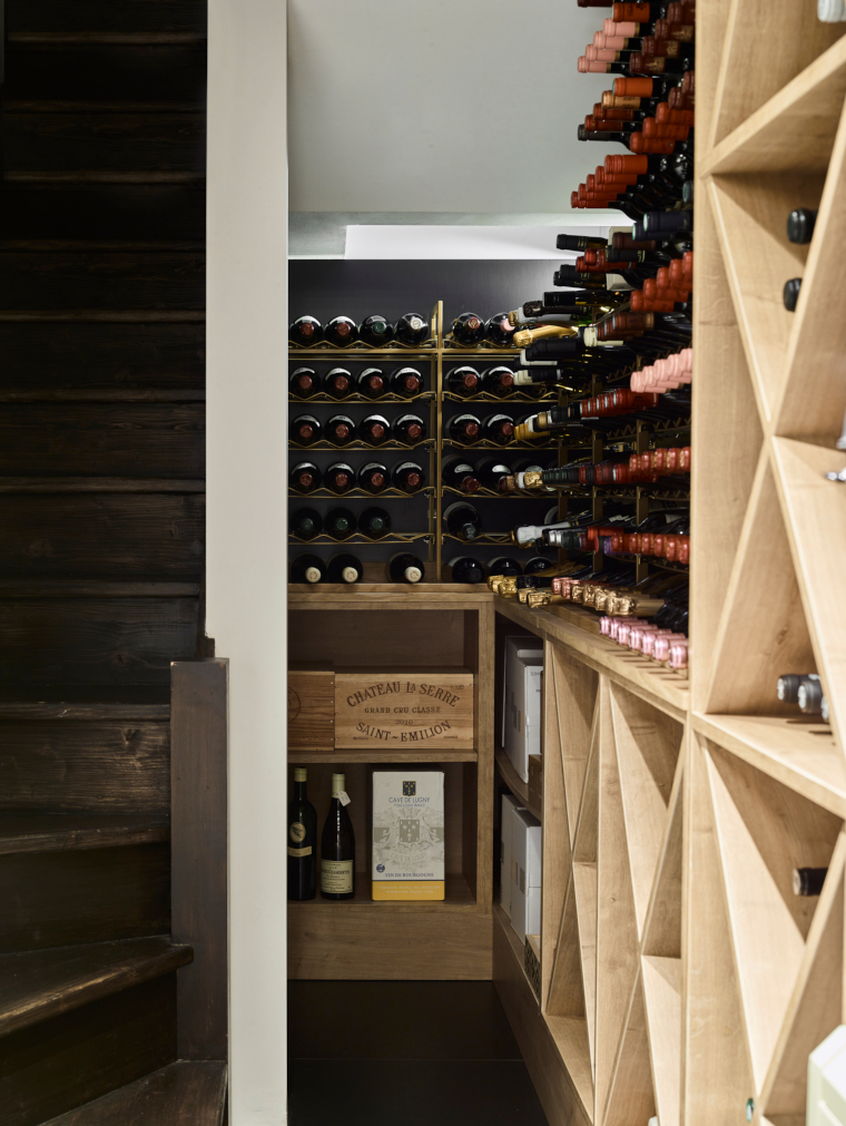 A key part of the design brief was for the architecture of the house to be reflected within the kitchen design. Taking this on board, the triangular skylights in the kitchen have been incorporated into the design with a bespoke brass triangle sink, brass detailing on the undercounter cabinetry and an angular pendant light. The triangle motif is also repeated in the wooden racks of the downstairs wine store.