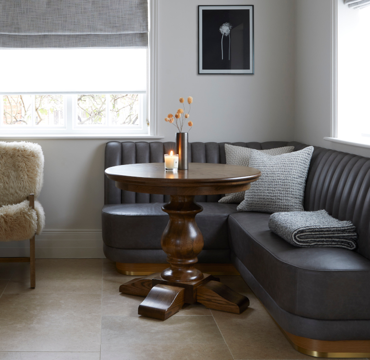 Downstairs, a wall was removed between the existing kitchen and a reception room as part of the reconfiguration. The kitchen was relocated to the back of this combined space to allow a better connection with the garden and a casual banquette seating area installed.