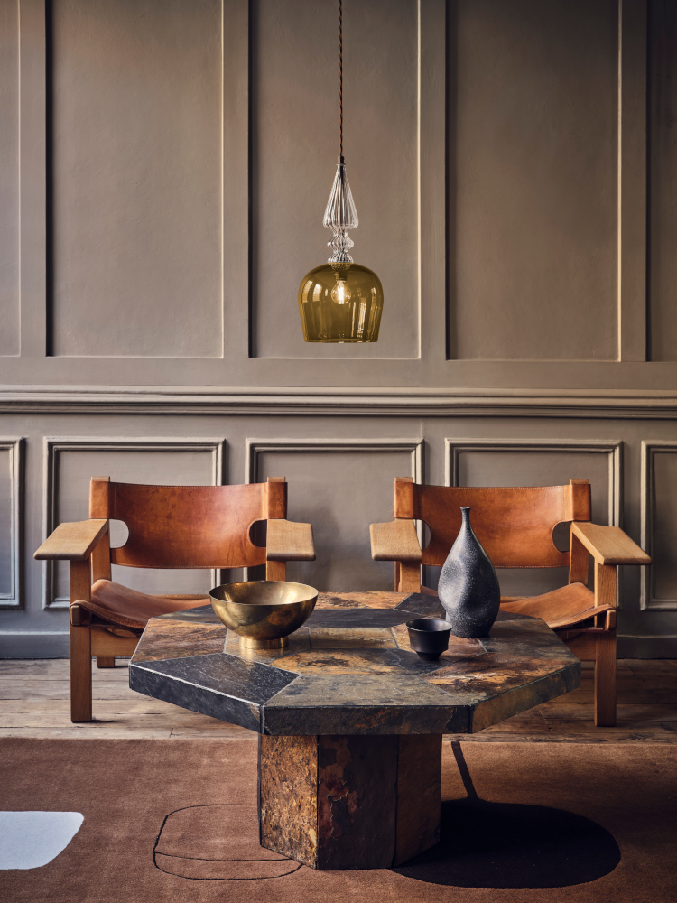 Developed by co-founders Victoria Rothschild and Mark Bickers, the new hue takes its design cue from the burnt amber coloured glass which was popular in the 1970s. The design casts a soft, warm outward light which is rich in texture, with the handblown glass shade providing illumination without shadow and the decorative optic spindle adding a decorative touch.