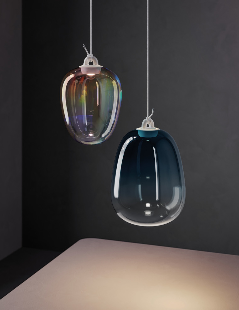The pendant light is made with Pyrex glass, its intense luminosity diffused through finishes including metallic blue, silk white, glossy smoke and transparent. The knotted cable is also a nod to the light’s nautical inspiration. Navone wanted the cord to resemble naval ropes tied to buoys. The fabric cable conceals the electric wiring that threads into the pendant to power the LED light.