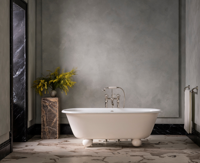 Generously rounded at the base, the bath’s body is subtly fluted to a broad rolled edge at the top. Upswept lines at the sides of the tub give a feeling of lightness that belies its solid cast-iron construction that sits on four oversized bun feet.
