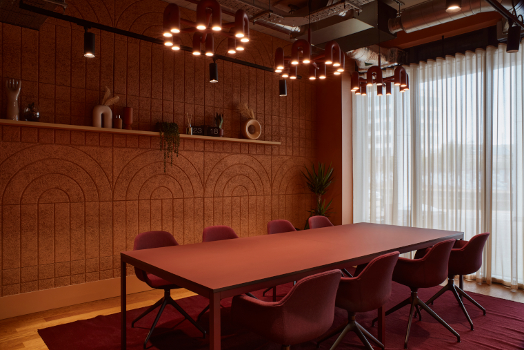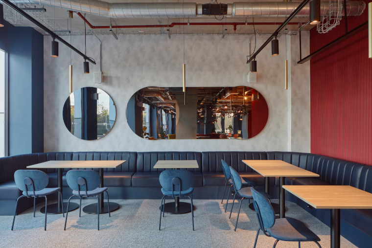 On the ground floor cool blues set the mood with rich wine tones creating comfortable lounge zones, all accented by pops of yellow and green. Textural elements give depth to the scheme – from plush upholstery to acoustic panels – making it a very tactile and homely experience. There is also a café, reception desk and conference room.